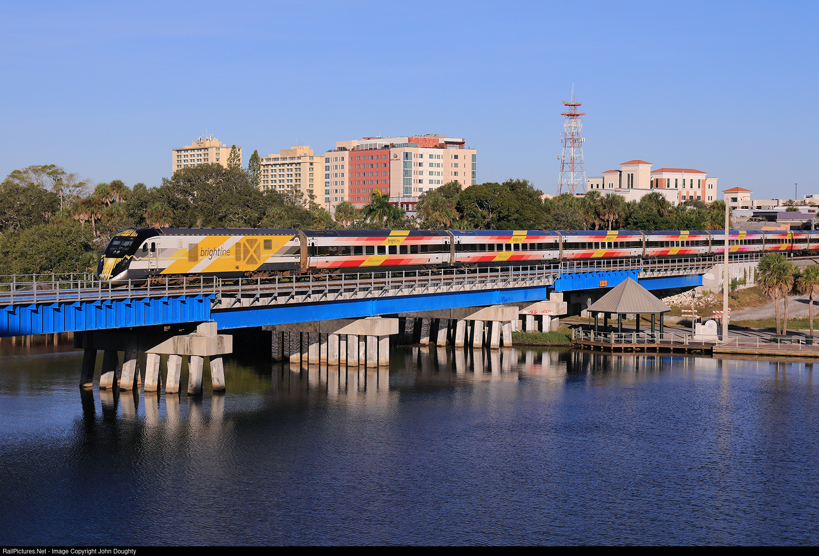 | Brightline 101 leads a 10 car passenger train south across the Crane Creek Bridge in downtown Melbourne, Florida. Brightline has been running a few of these 10 car passenger trains for the last few month. Canon 5D Mark IV. |
