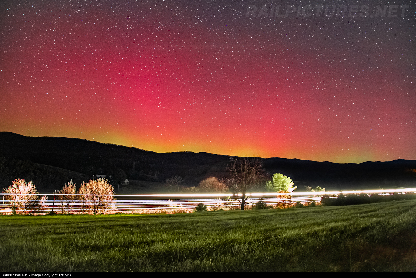 An empty grain train clatters down the Buckingham Branch around 11 PM. The solar storm begins its most intense hour, turning the sky a dazzling mix of reds, oranges, and greens.