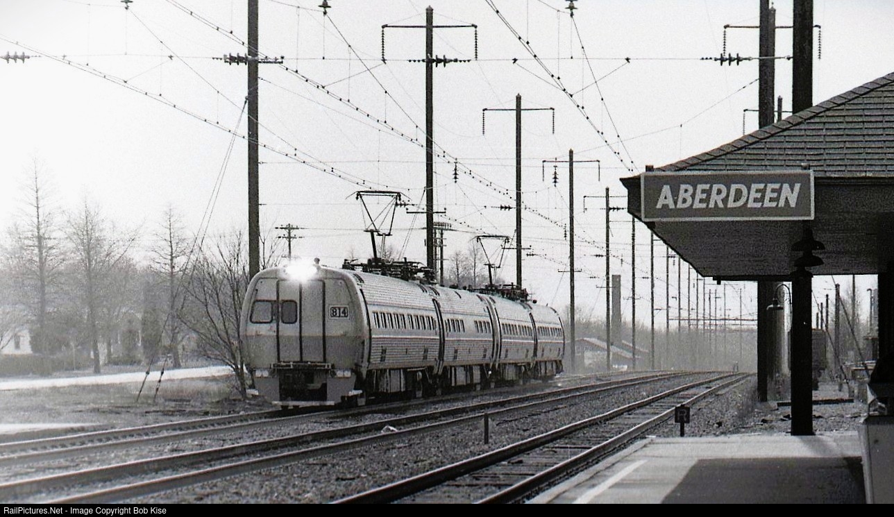 The late morning sun is finally beginning to burn off the fog, as a northbound Metroliner passes through Aberdeen. Scanned from a Kodak Tri-X Pan 400 negative.