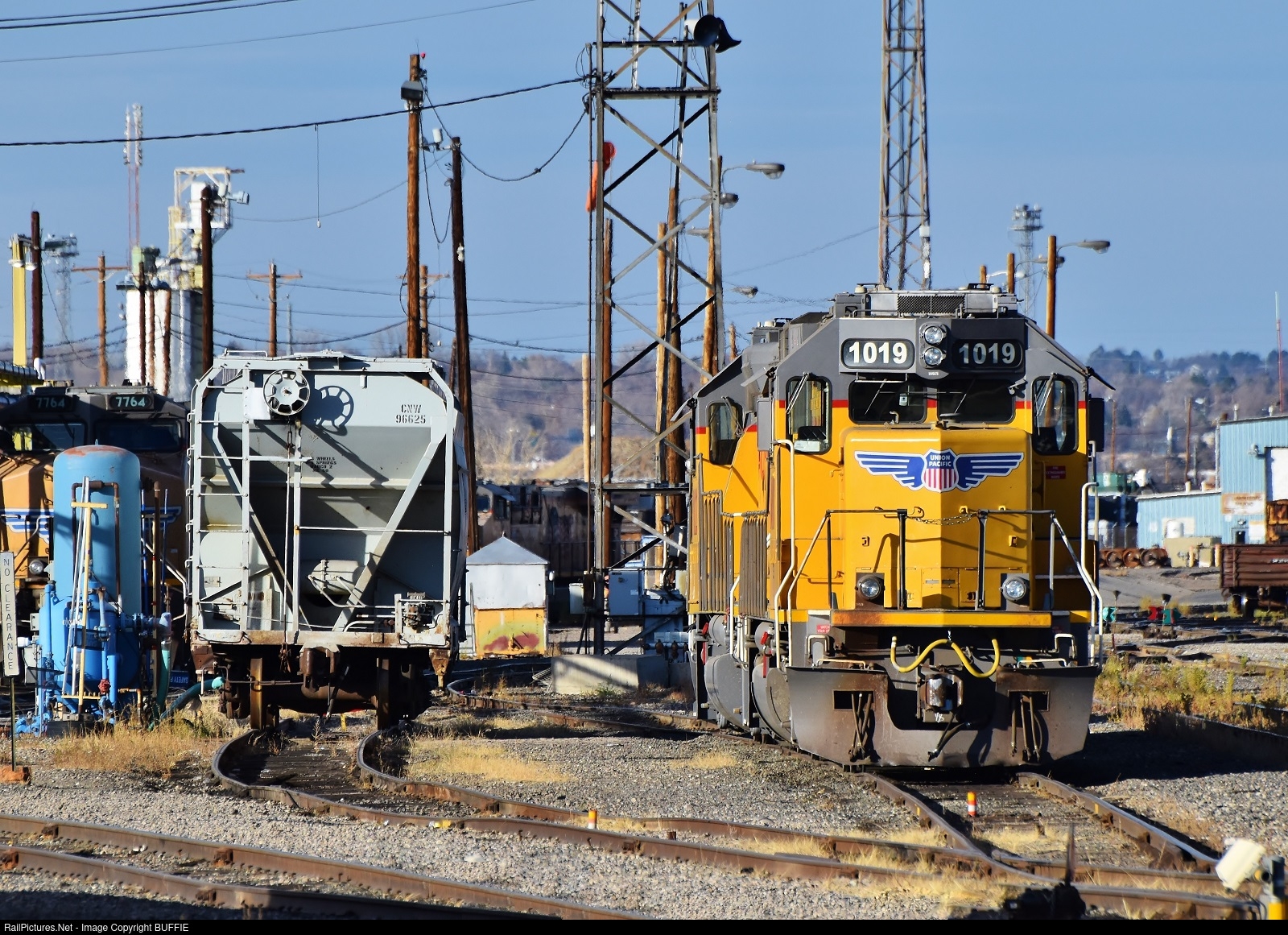| UP 1019 (GP60) sits next to an old Chicago Northwestern sand car and will soon get the call to action to head into the North Yard in Denver, Colorado.