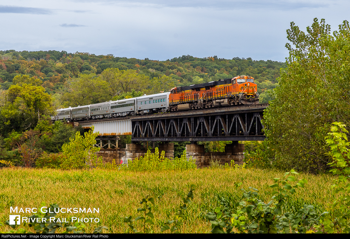 BNSF Office Car Special Over The Mohawk. On Wednesday, September 17, 2025, the Burlington Northern Santa Fe (BNSF) Office Car Special arrived at CSX's Selkirk Yard in Selkirk, New York. This highly unusual move is to bring the train to Long Island Railroad (LIRR) to serve as the railroad's base of operations for business during the upcoming Ryder Cup PGA competition at Black Course at Bethpage State Park. The 14-car train would later be moved by CSX and Amrak to be handed off to LIRR. The train was parked while on Long Island, and did not planned to operate prior to the end of the event. The train is seen crossign the Mohawk River in Pattersonville, New York.