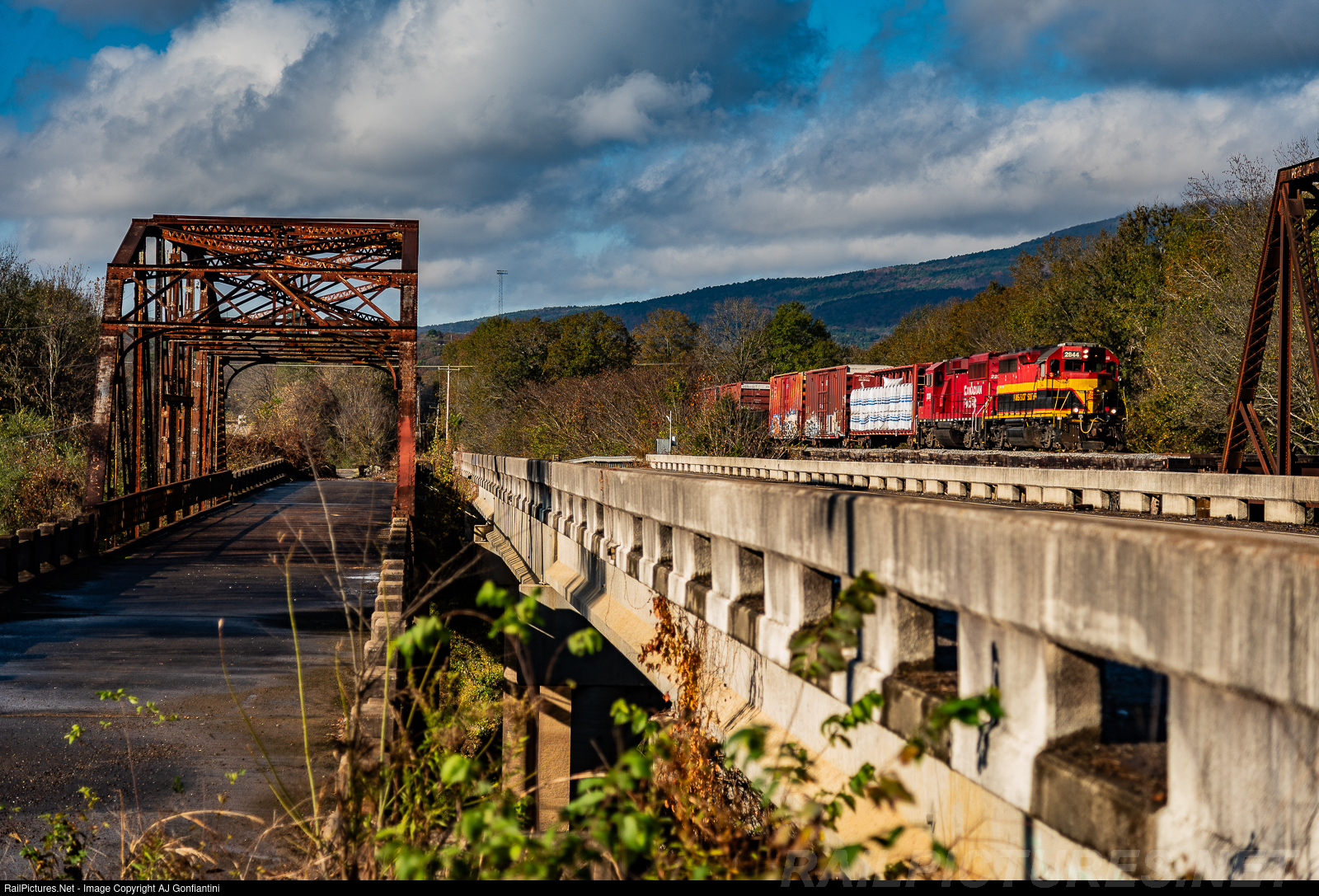 A KCS GP40 and a CP GP20C-ECO lead the Dodger Local across the Poteau River Bridge in Poteau.