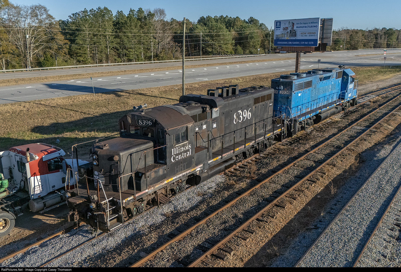 | Former Illinois Central GP10 8396 and Conrail GP38 2036 are the power for the Athens Line, part of the Hartwell Railroad/ Great Walton Railroad in northeast Georgia. The Athens Line operates freight over a former Central of Georgia line between Athens and an interchange with Norfolk Southern at Center, a small dot on the map between Athens and Commerce. |