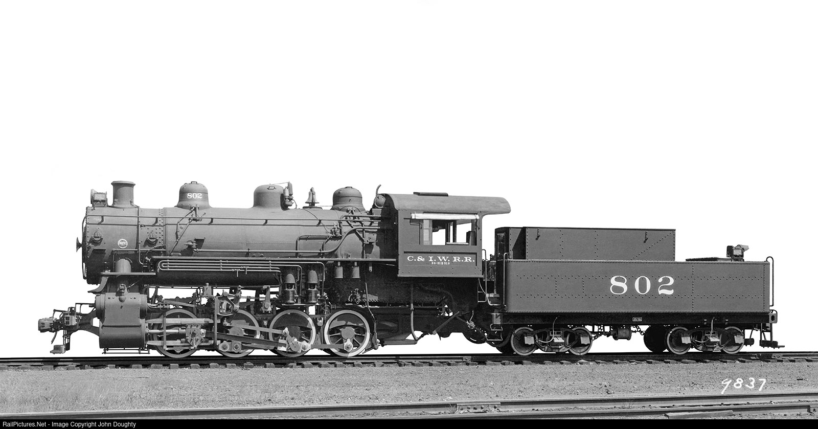 This 0-8-0, number 802, was built by the Baldwin Locomotive Works for the Chicago and Illinois Western Railroad. The total engine and tender weight was 380,000 lbs., and the tractive effort was 51,040 lbs. BLW construction number was 59,372. This Baldwin Locomotive Works builders photo card is from the John R. Doughty collection.