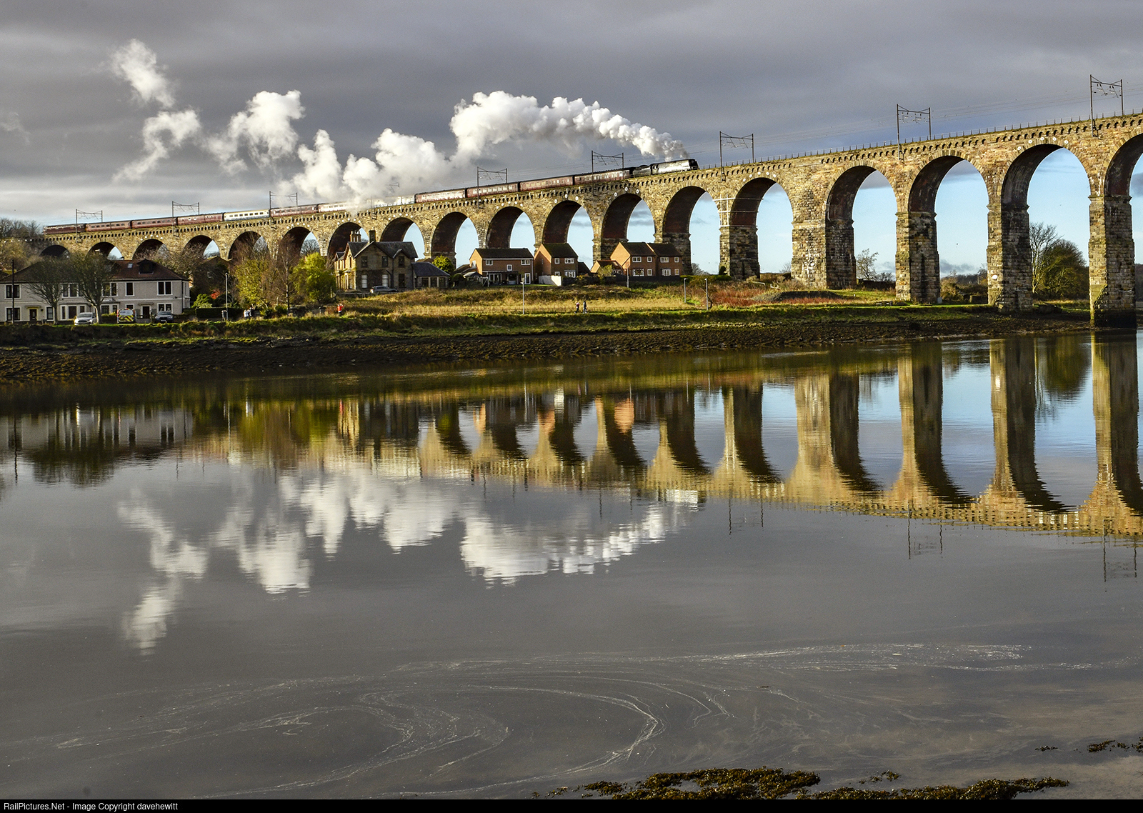 A York to Edinburgh special for the Christmas market at the Scottish capital hauled by Tangmere a Battle of Britain class locomotive, crosses over the River Tweed on the Royal Border bridge opened in 1850 by Queen Victoria.