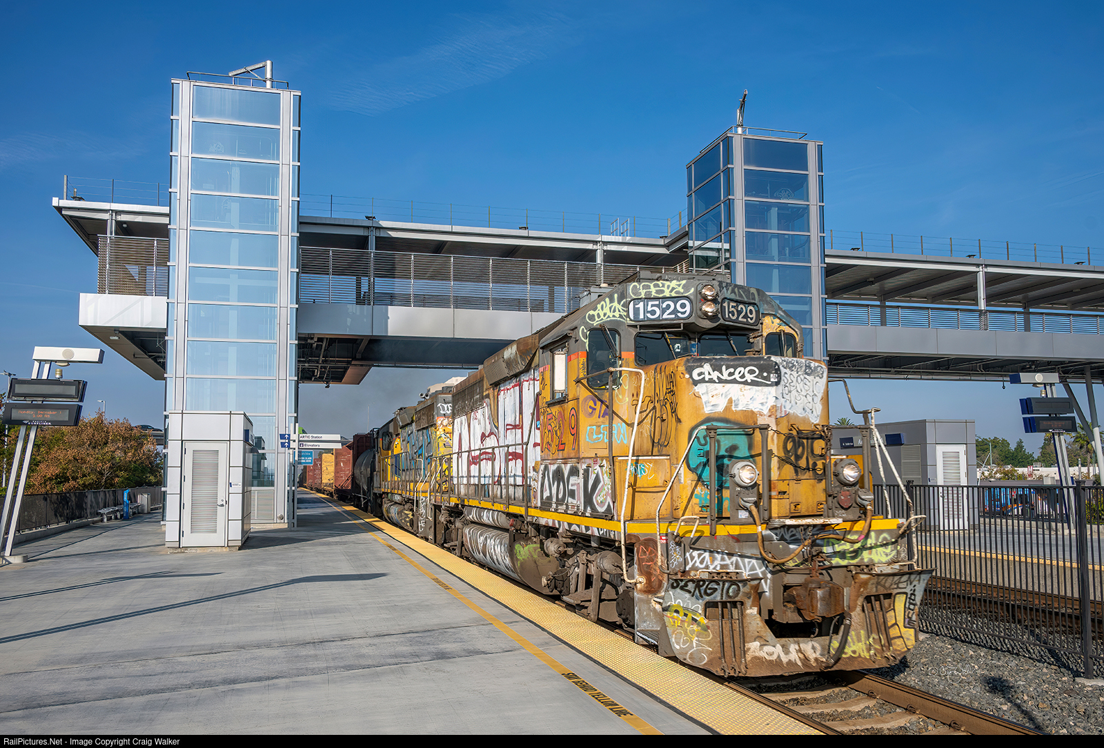 Passing through the Anaheim Regional Transportation Intermodal Center (serving Amtrak, Metrolink and both long distance and local busses) is Union Pacific local LOA32, known at the Costa Mesa local. This train heads from Anaheim to Santa Ana and back every Monday and Wednesday. UP GP40 1529 (classed as a GP40M-2 on the UP) and GP40-2 1400 have 1 tank car, 5 centerbeam flats and another 3 tank cars in tow.