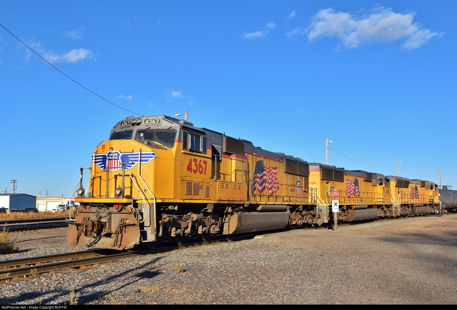 | UP 4367 (SD70M) bring a freight into the Union Pacific yard in LaSalle, Colorado after arriving from Cheyenne, Wyoming.