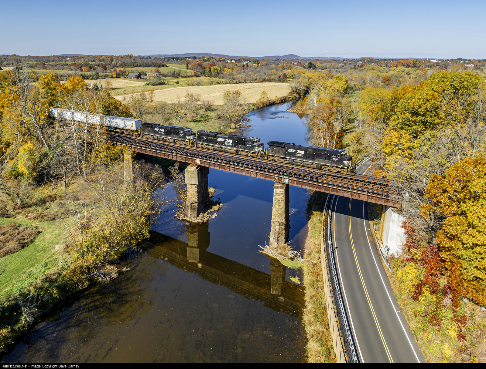 Three NS motors bring an Eastbound Intermodal across the south branch of the Raritan River at Neshanic Station.