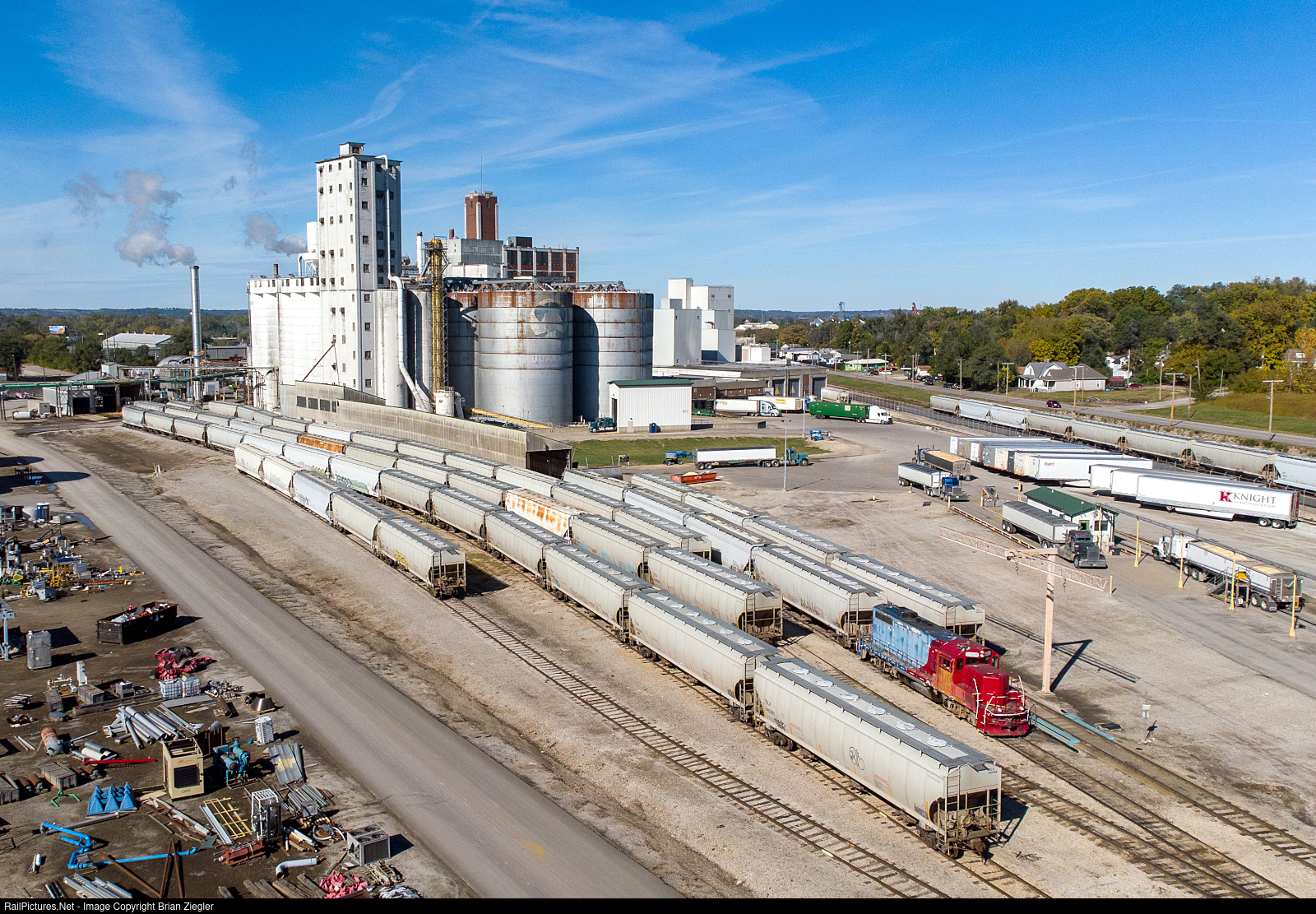 A busy afternoon at Lifeline Foods LLC (formerly Quaker Oats) with trucks coming and going along with their GP10 warming up to start switching cars.
