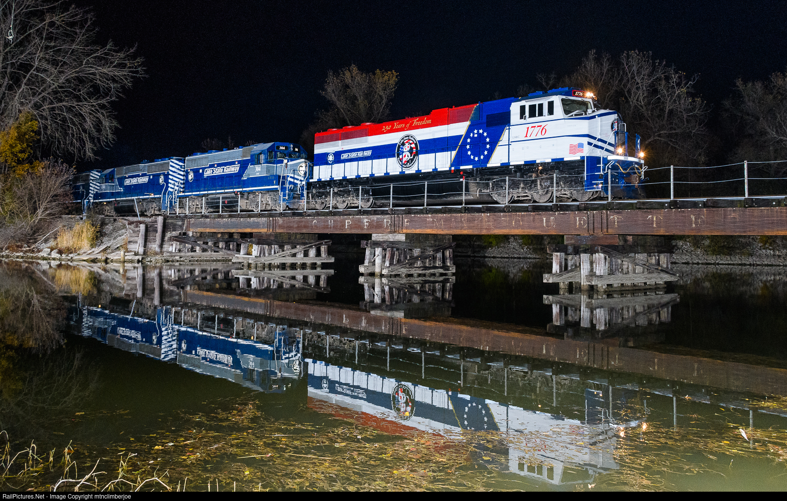 | With the Lake State Railway 1776 locomotive leading the way, train 310 heads towards Saginaw, crossing Chebovganing Creek south of Bay City, Michigan after dark. LSRC 1776 was recently painted in a special scheme to commemorate the United States Semiquincentennial in 2026. |