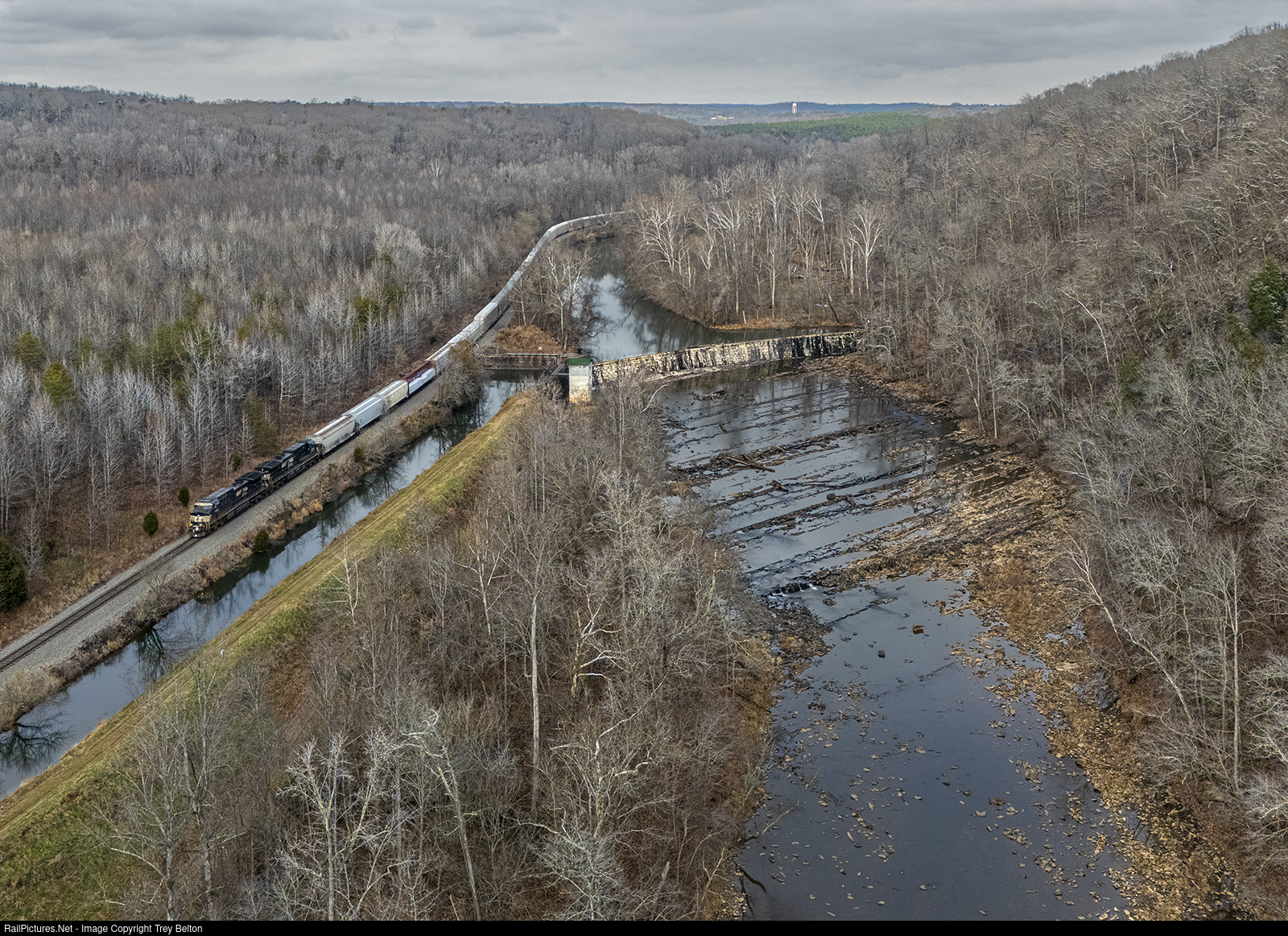 | The NS 4321 leads the 18W by the 125 year old Avalon dam still holding back the Mayo River. The dam is still used for hydro power production today. It originally powered the Avalon textile mill which burned in 1911. The Mill was then rebuilt about 3 miles south in the town of Mayodan and the small town of Avalon was abandoned. |