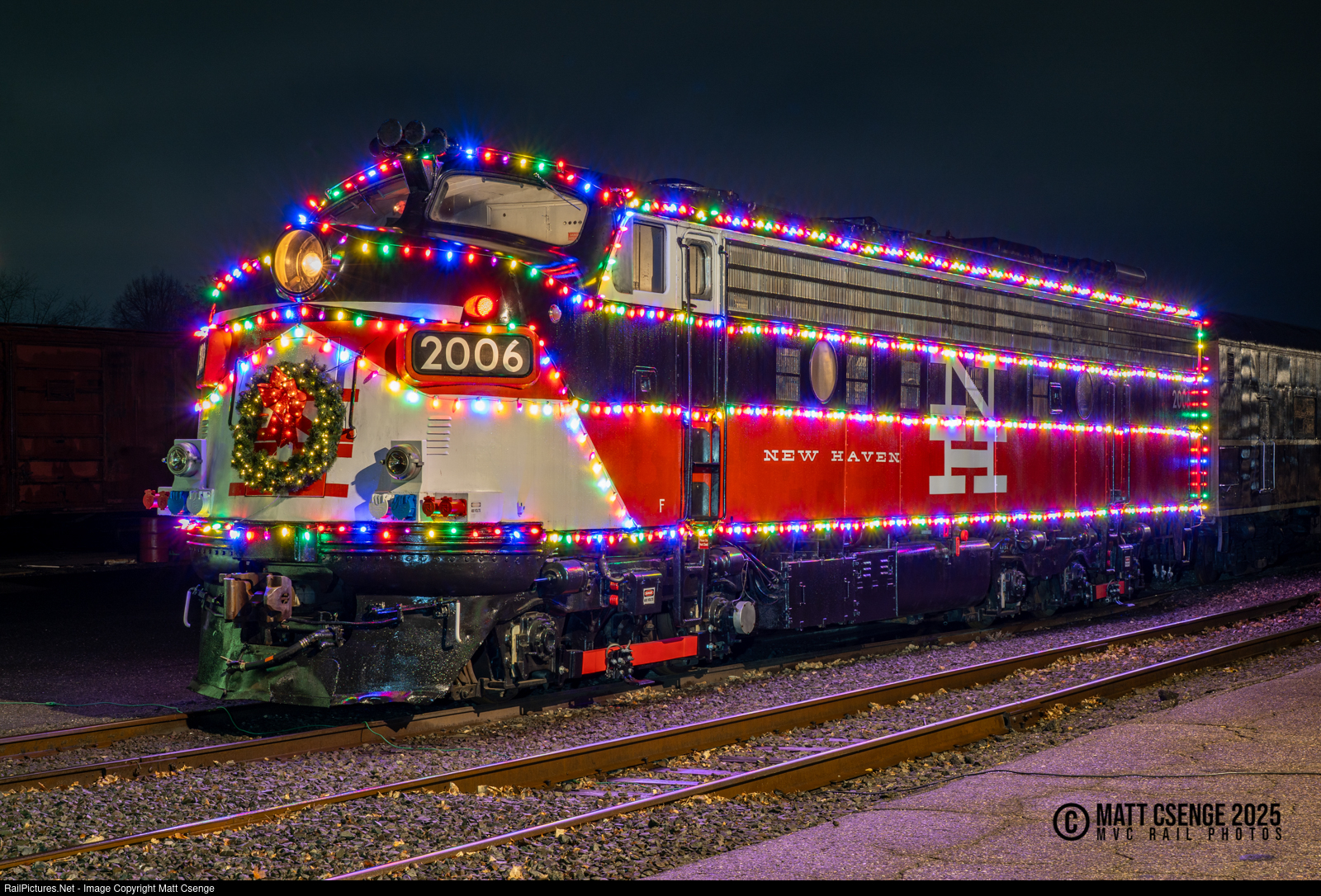 New York, New Haven & Hartford Railroad (NH) FL9 no. 2006 is on display at the Danbury Railway Museum, adorned with festive lights for the holiday season. The locomotive is one of 60 such dual-mode locomotives built specifically for the New Haven from 1956-1960. The "L" in the model number actually stands for "long," since it is longer than the standard F9 to include a larger steam heating boiler and electrical equipment for third rail operation. The additional weight of the equipment also required a three-axle rear truck to meet loading restrictions, giving the locomotives an uncommon five-axle B-A1A wheel arrangement.