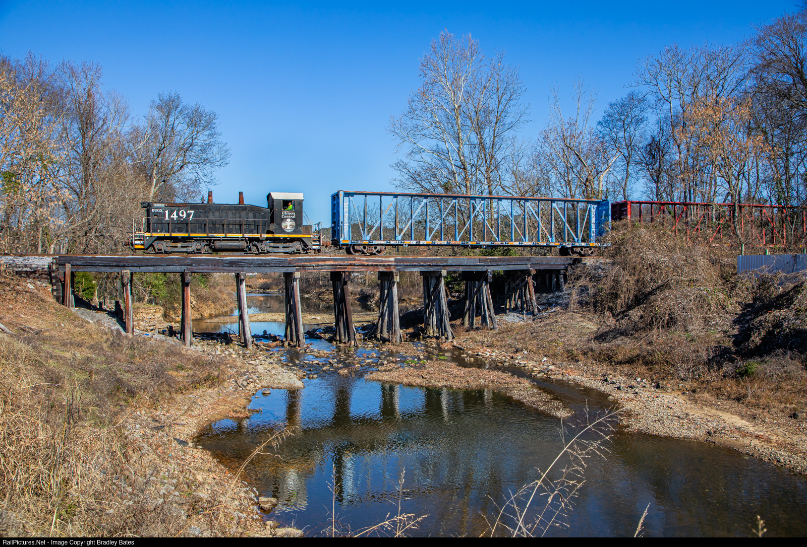 BUGX SW14 #1497 leads ATN Job 102 back to their yard as they cross Black Creek in Gadsden, AL. with 5 empties from Dairyman's Supply Company in Glencoe, AL.