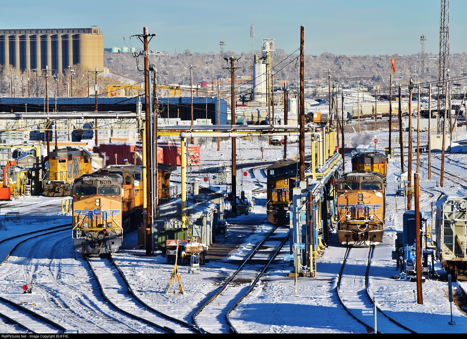 | A pair of heavy motors get fuel and sand at the servicing island at the North Yard in Denver, Colorado.