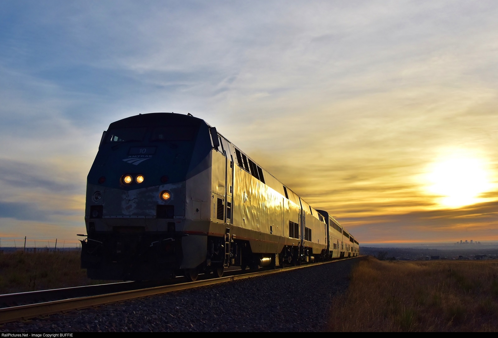 | One of the oldest Amtrak motors leads the Winter Park Express Ski Train west on the Moffat Tunnel Sub at sunrise, leaving the Denver Skyline visible in the lower right behind.