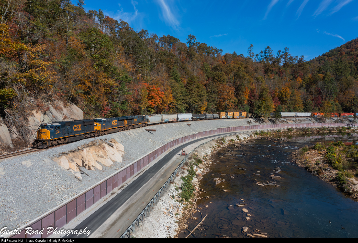 CSX #4754 leads M652-16 (Rocky Mount, NC to Russell, KY) along the new flood wall built after Hurricane Helene destroyed much of the Clinchfield in the Fall of 2024.