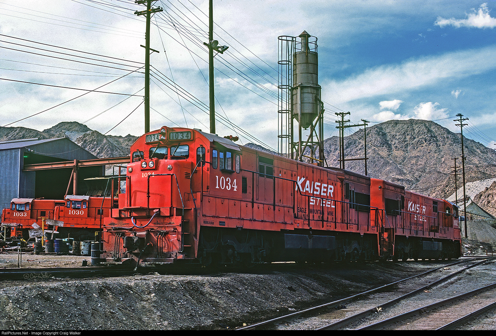Four-fifths of the Kaiser Steel U30C fleet is visible in this photo of their shops at Eagle Mountain, in California's Colorado Desert. Built in 1968 for Kaiser's Eagle Mountain Railroad, which hauled iron ore from the company's Eagle Mountain Mine, U30Cs 1030 to 1034 were constructed pretty much to the specifications used on Southern Pacific's U30Cs. These five, however, each weighed six-tons more than a standard U30C. Trains originated here in Eagle Mountain, and then traveled fifty-one miles to Ferrum Junction, where the cars were interchanged with the Southern Pacific. SP would then haul the ore cars another 110 miles to the Kaiser Steel Mill in Fontana, California, for the production of steel. Ore trains from Eagle Mountain ceased operations on March 24, 1986, and the U30Cs were reportedly scrapped at Fontana in 1995. In early 1984, Kaiser began winding down operations at their Fontana mill. A reduced mill, now owned by California Steel Industries, is still in operation and profitable. Today, however, the steel is imported and arrives at the mill on special steel slab cars owned and operated by BNSF Railway.