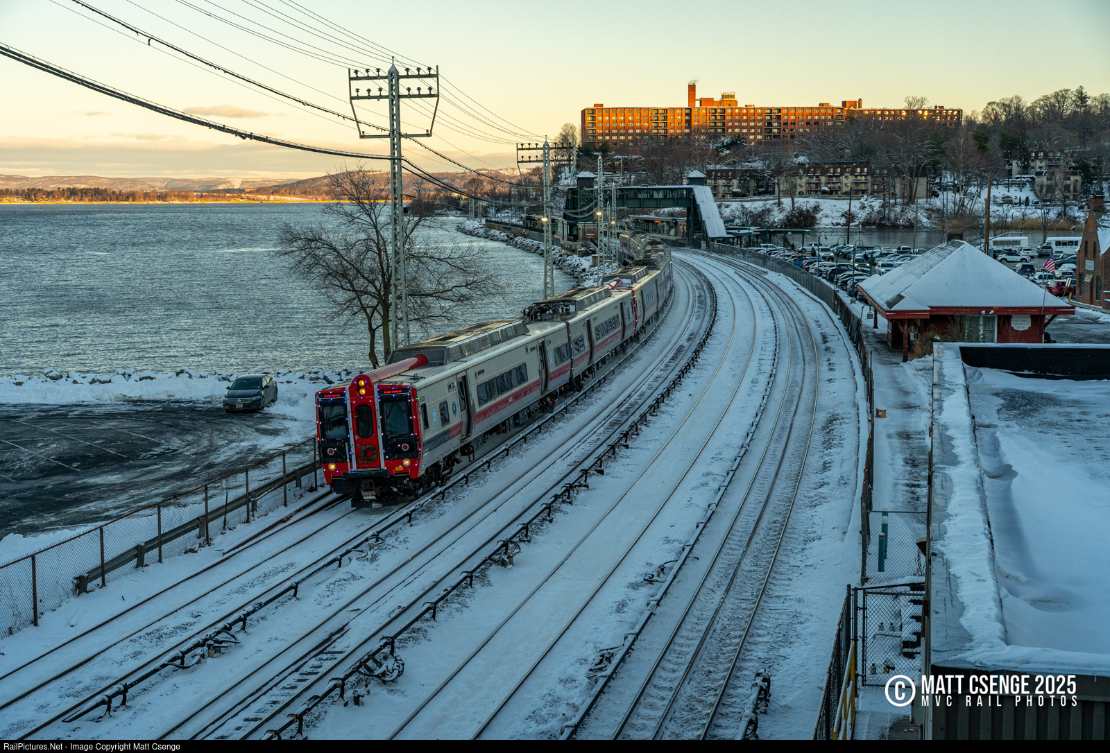 Metro-North Railroad (MNR) M8 car 9231 leads the electric Holiday Lights Train around the curve at Scarborough, operating as Hudson Line train 732 to Grand Central. Aside from the fact that it's the decorated train, seeing M8 cars in service on the Harlem or Hudson Lines is uncommon, as they are typically reserved for New Haven Line service. They were chosen for the lights train as their ability to operate on overhead wire or third rail allows them to run to any electrified areas of the system. |