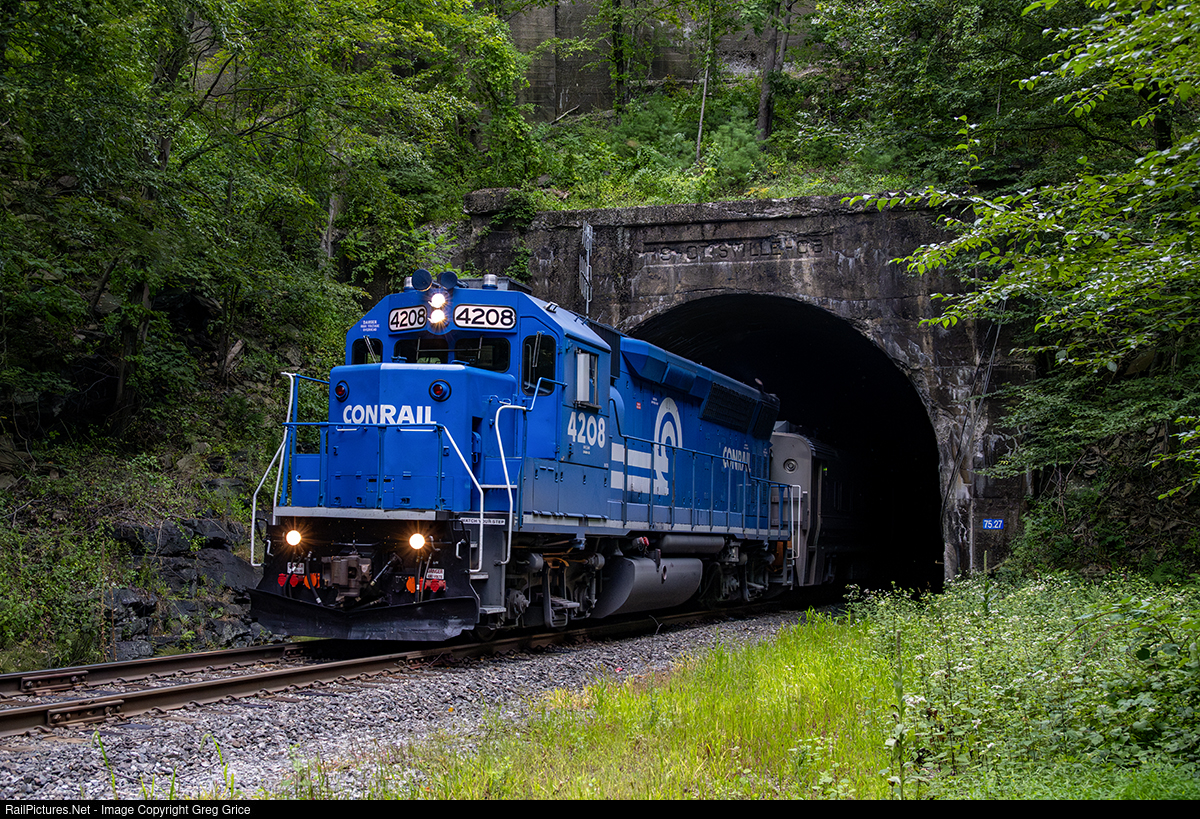 New Jersey Transit’s Conrail Heritage GP40PH-2B #4208 emerges out of the out of the former Erie Railroad Otisville Tunnel as it leads train 43 up the Port Jervis Line in Otisville, New York.