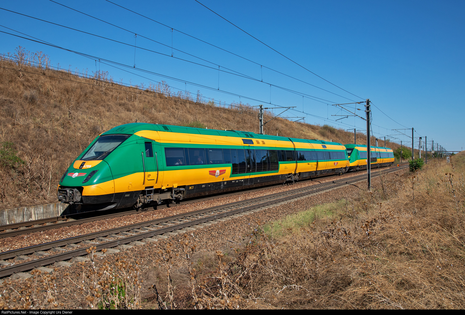 | The two two-car diesel multiple units MP5709/FP6709 and MP5713/FP6713 of Astra Trans Carpatic are operating as train IR 11505 from Bucharest North to Mangalia.