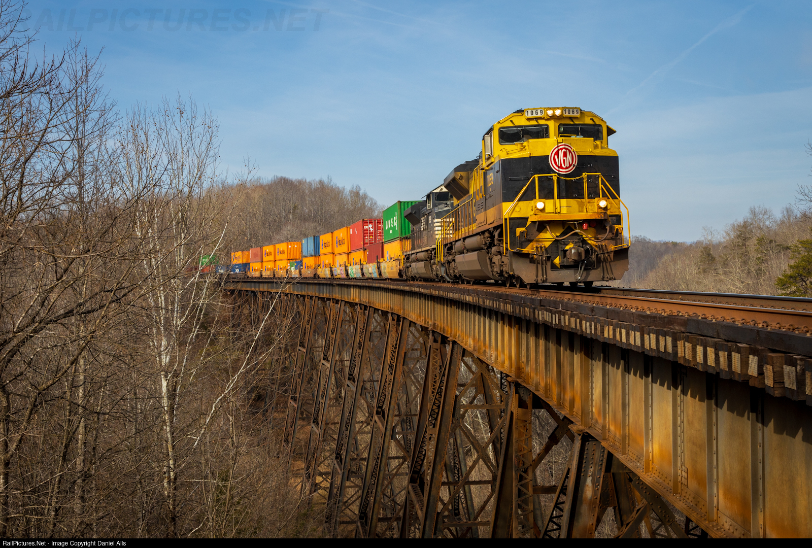 | Virginian on the Virginian, you can’t get much better now a days. The Virginian heritage leads a short 278 eastbound over Kates Creek trestle along the old Virginian in Goodview, VA. |