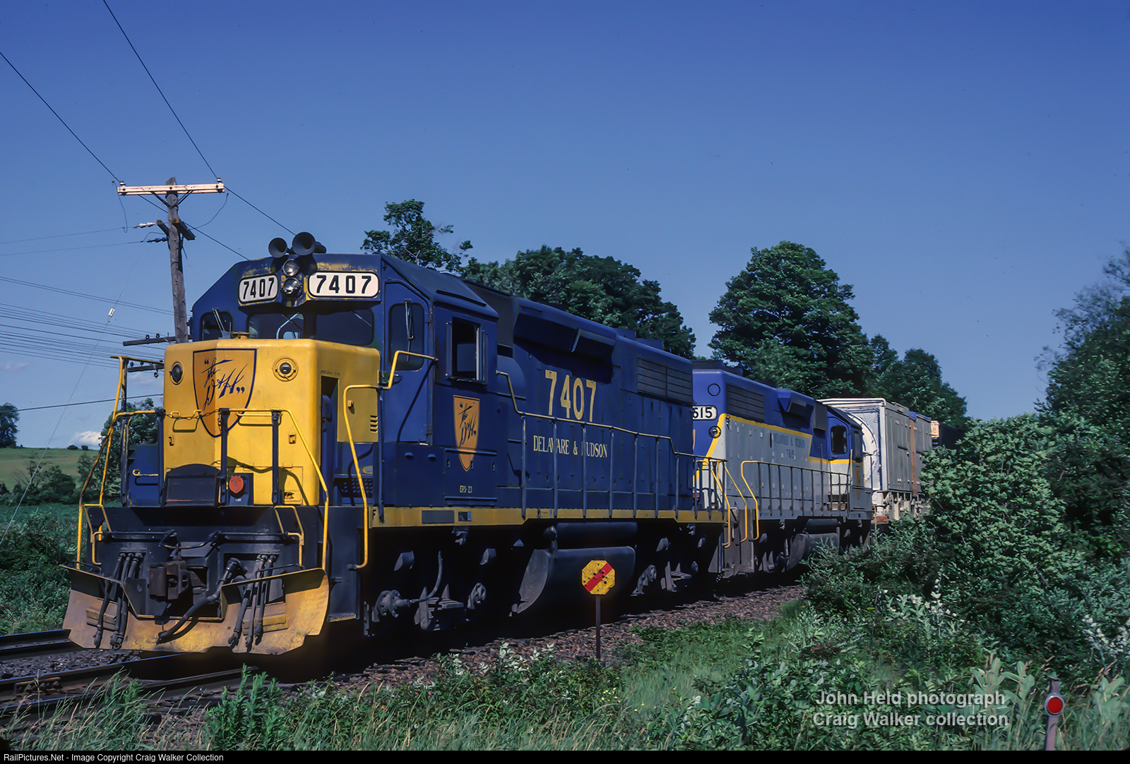 Delaware & Hudson Railway GP39-2s 7404 and 7615 roll through upstate New York with a freight. D&H 7404 is the former Reading Line 3404 (some of the old RDG yellow is showing through on the numberboards, while companion 7615 was purchased new in 1976 by the D&H, and wears their earlier – and much more attractive – blue and grey paint scheme.