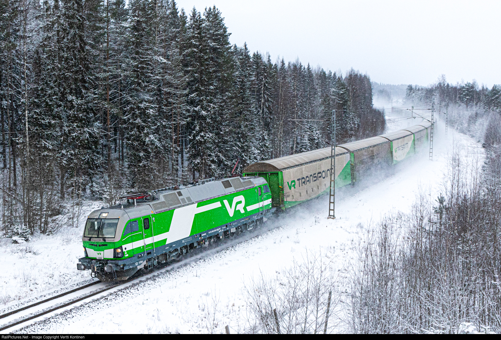 | The daily pulp train from Äänekoski pulp mill to the port of Vuosaari in Helsinki rounding a curve just before the underpass below highway 9 (E63). Pulling the train is VR class Sr3 3328 |