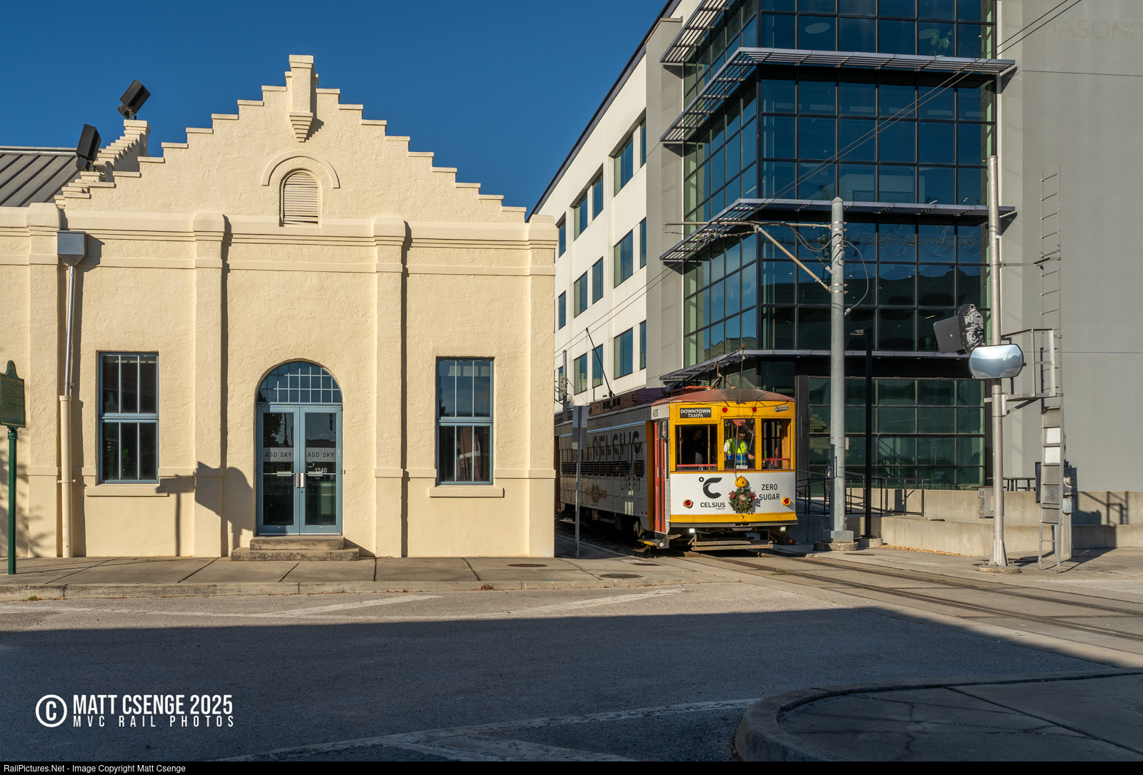 TECO Line streetcar 435 peeks out from between buildings on E 5th Ave as it makes its way south towards downtown Tampa. The trolley is a replica Birney car manufactured by the Gomaco Trolley Co., which blends nicely with the historic architecture prevalent in Ybor City. |