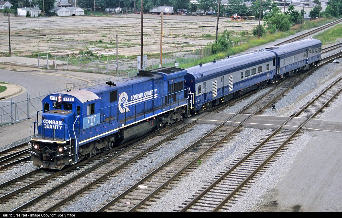 CSX C36-7 7117 in its former CR paint leads a track geometry train from Louisville.