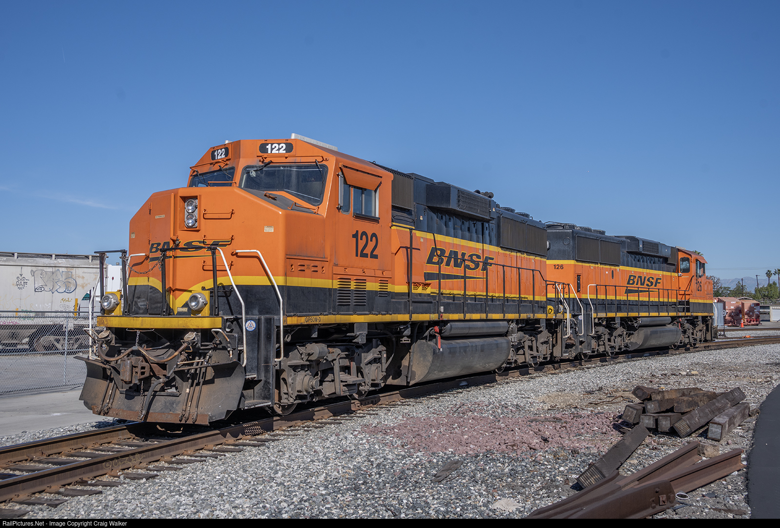 Among the Geeps parked in the yard this day were this pair: BNSF GP60Ms 122 and 126. (BNSF classes these as GP60M-3 locomotives.) Each of these two were built by General Motors Electro-Motive Division in June 19960 for the Atchison Topeka & Santa Fe Railway, with the same numbers (122 and 126, in this case) and delivered in the Railway’s impressive "Superfleet" scheme, adapted from their classic red and silver "Warbonnet" scheme dating back to the 1940s – which was a brilliant move on the Santa Fe's part!