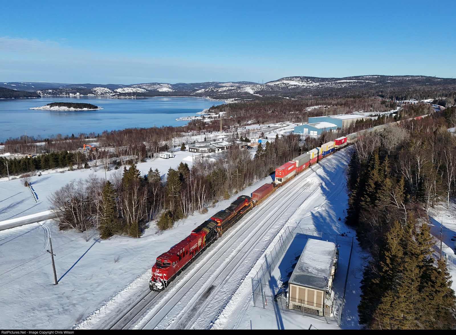 | CP ET44AC 7457 + KCS AC4400CW 4596 haul 118's train into Marathon curving around Peninsula Harbour with 13,000ft of intermodal traffic |