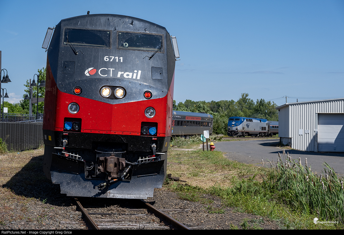 On August 23rd, 2025, CTrail Extra 6711, powered by GE P40BH 6711, sits on the Berlin Industrial Track as Amtrak Extra 96 passes by on the MRS (Hartford) Line main in Berlin, Connecticut. Both extra's were in Berlin to support a joint emergency preparedness exercise. CTrail and Herzog hosted a tabletop exercise and equipment walkthrough off the MRS main line with local first responders to familiarize them with Hartford Line equipment, railroad safety, and interagency coordination.