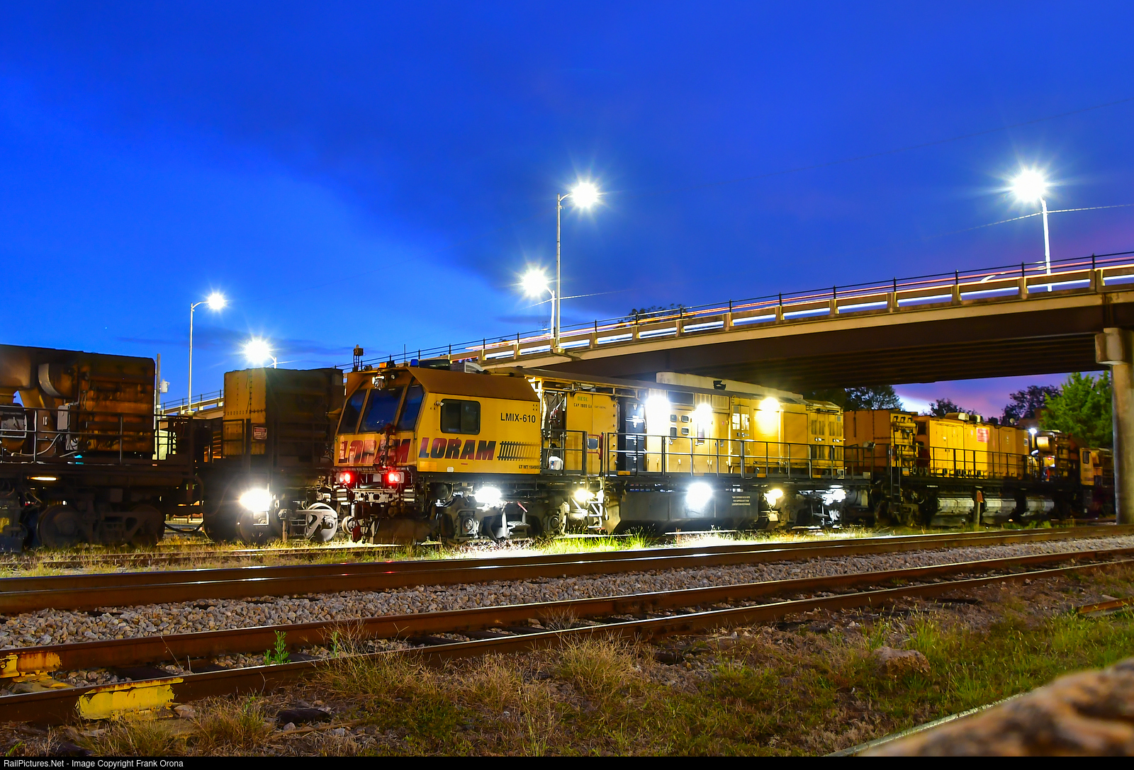 | The Loram rail grinding equipment makes a short stay in Opelika this evening as they prepare for night time work. This LMIX 610 is the shorter grinder used to grind rails on special track work such as turnouts and at road crossings. This unit and the larger RG400 series unit behind it will work north after rail traffic has moved out of the way. Click here to learn more about this unique device. |