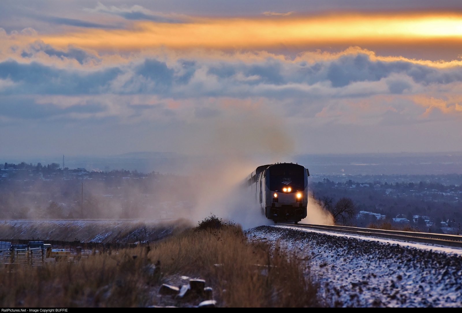 | The Winter Park Express Ski Train kicks up the fresh snow as it climbs out of Leyden, Colorado at sunrise on the Moffat Tunnel Sub.