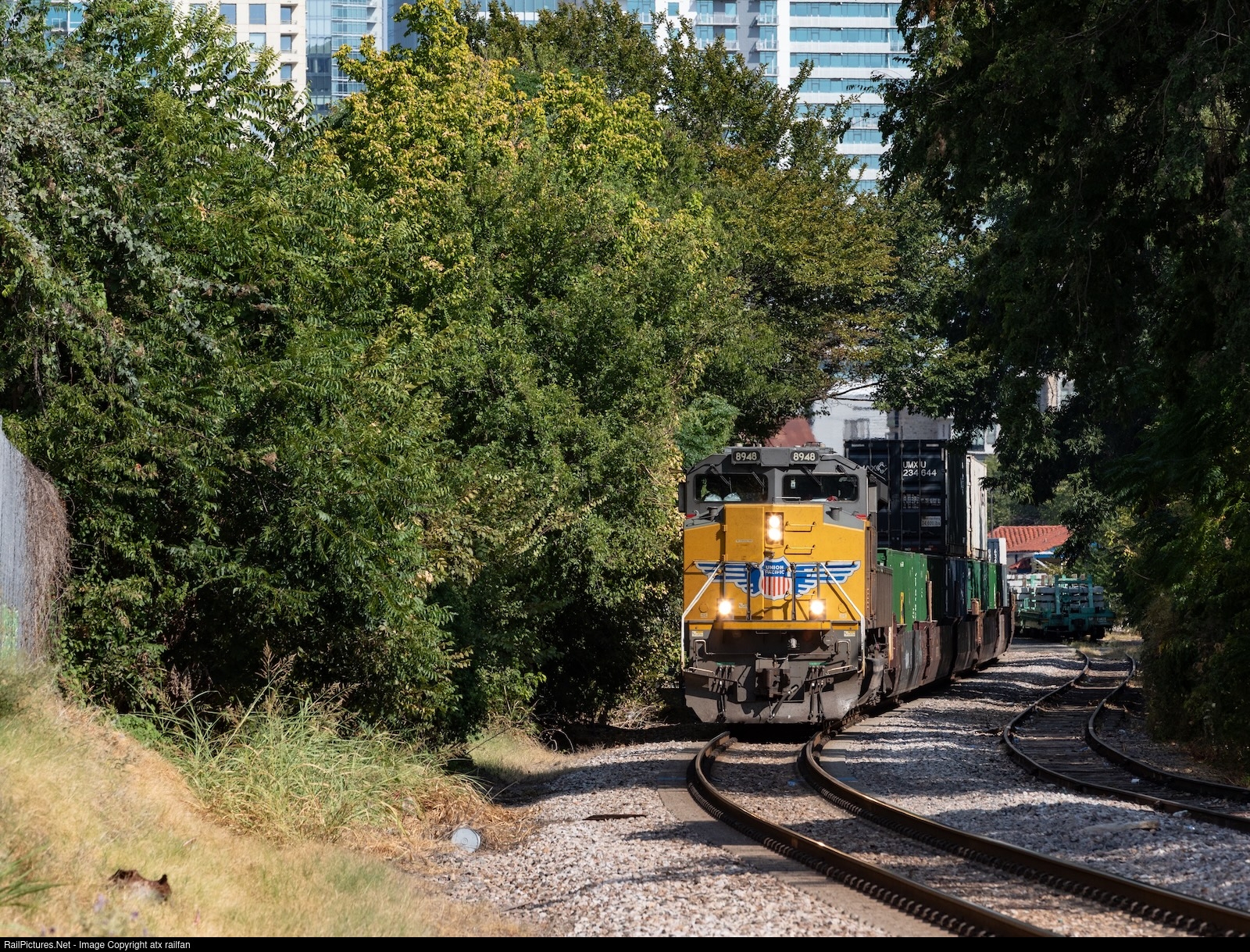 UP 8948 leads the northbound ILDYC (Intermodal, Laredo, TX to Dolton, IL/Yard Center) around the S curve in downtown Austin.