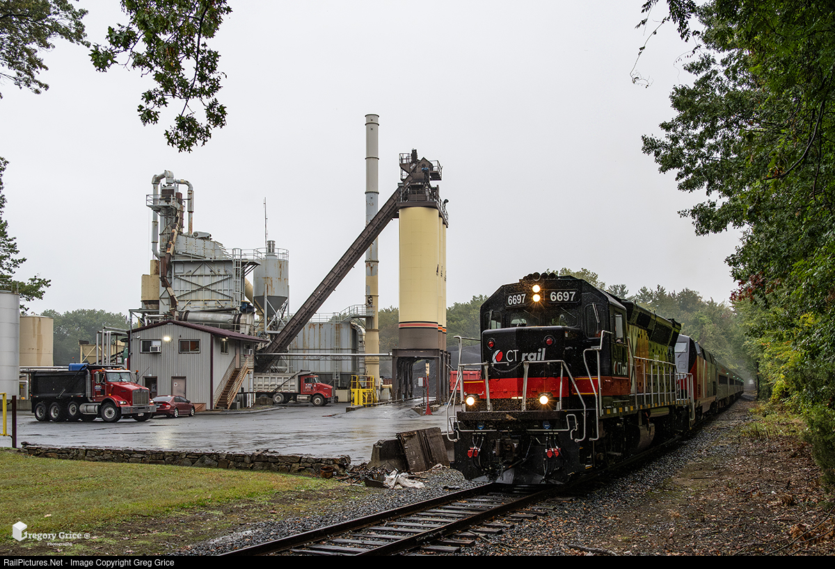 On September 25th, 2025, CTrail Extra 6697, powered by EMD GP40-3H #6697 and GE P40BH 6705, passes the JSL Asphalt plant at King Spring Road on the Bradley Industrial Spur in Windsor Locks, Connecticut. The 6-car doubleheaded extra train was heading to the Connecticut Army National Guard's Camp Hartell base in Windsor Locks, Connecticut for a joint emergency preparedness exercise.