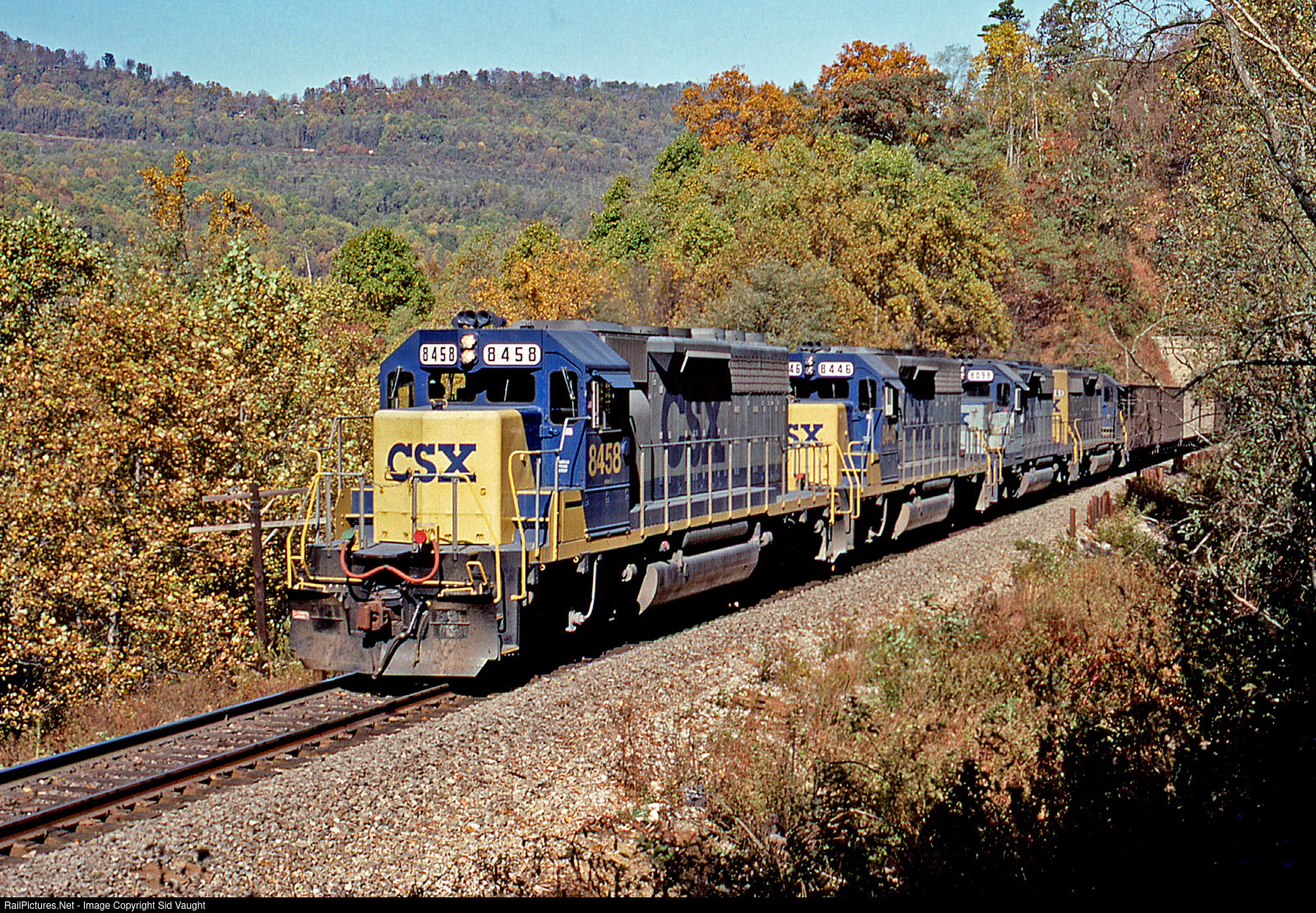 | Where were you........? Well, on 10/19/1991 I was on the famous loops of the former Clinchfield when I caught this southbound freight midst autumn beauty. |