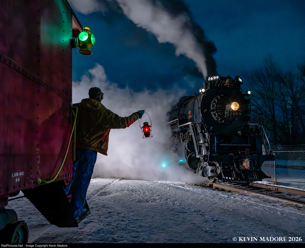 This image was captured in the Owosso Yard, on Michigan's Great Lakes Central Railroad. The featured locomotive is Pere Marquette Railroad N-1 Class, 2-8-4 "Berkshire" Locomotive #1225, which was re-lettered as C&O 2699 for a January 2026 photo shoot organized by Lerro Photography. The 1225 was re-lettered to represent the former PM N-Class Berkshires, which were renumbered when the Pere Marquette Railroad merged with the Chesapeake & Ohio in 1947.