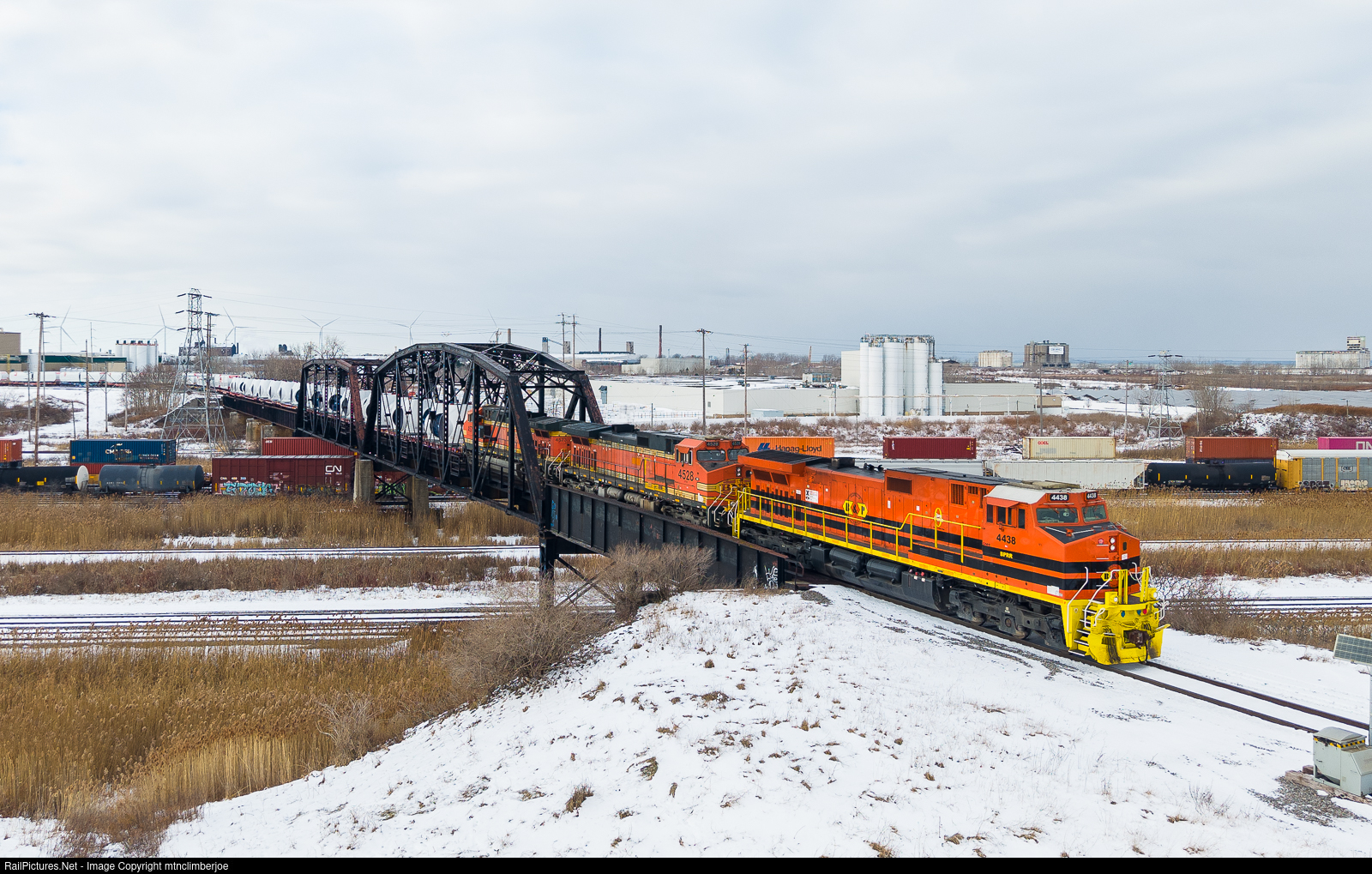 Led by a trio of C44-9W's, a Buffalo & Pittsburgh extra hauling wind turbine parts crosses the long bridge at Tifft, New York as it departs from the South Buffalo yard where the train was picked up. This bridge crosses over CSX, BSOR, and NS trackage, where CSX I162 and M364 are passing underneath.