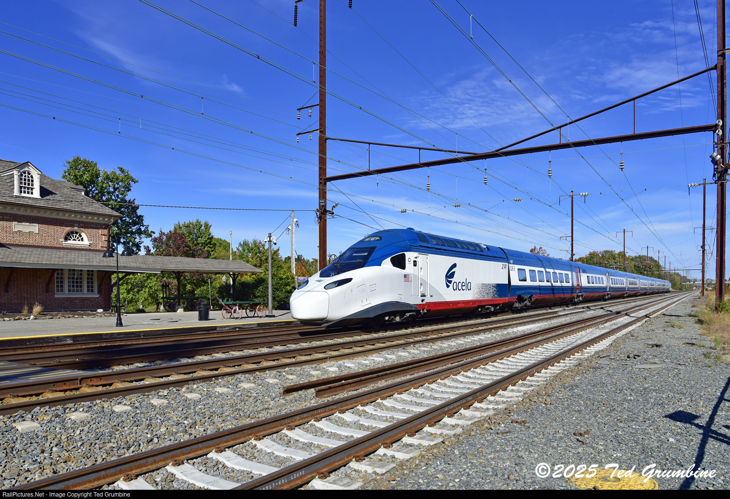 | NextGen Acela Trainset 14 handles the Train 2251 assignment-here southbound passing the Perryville MARC Station-on October 18, 2025. |