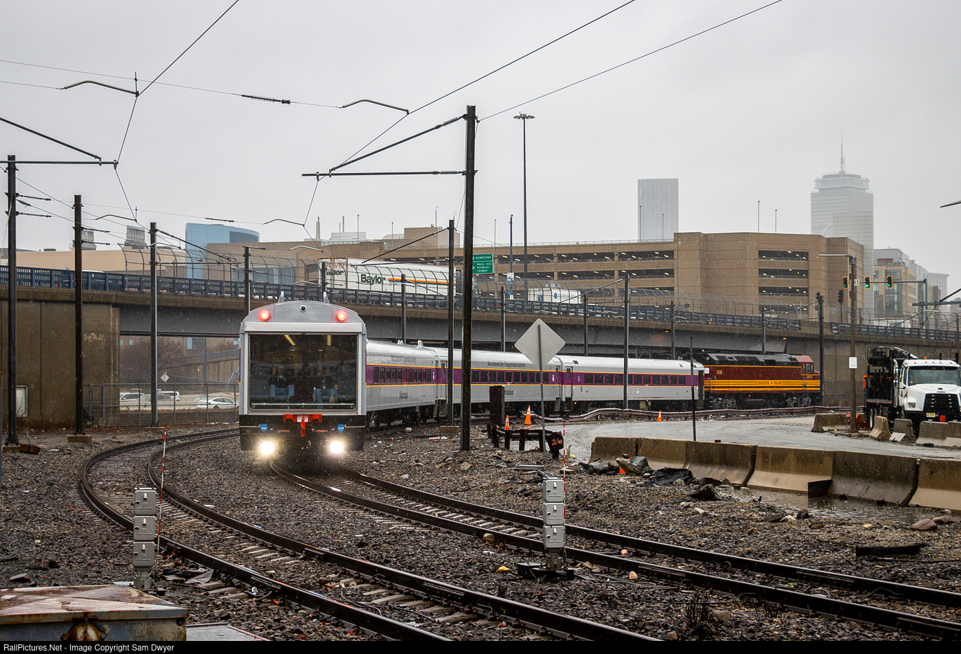 After pausing for some train traffic, the MBTA's new theatre car continues leading the Office Car Special's shove to South Station, where it'll head to Rhode Island with MBTA executives onboard. On a rainy day like today, it must be nice for the conductor to get to sit in a luxurious, enclosed car, like the Mayflower.
