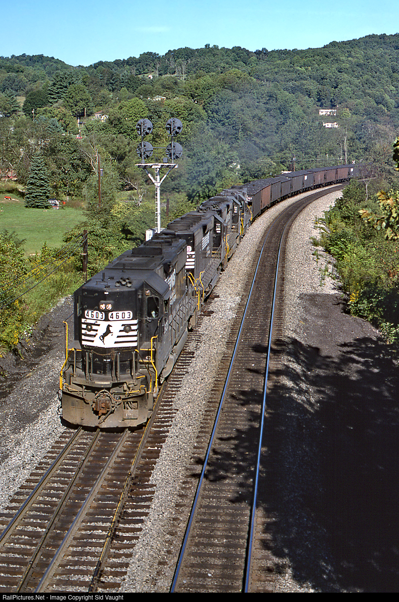 | For once Southern was ahead of the crowd, testing these prototypes. Now post-merger ordinary power, this one is leading eastbound coal beginning the long climb to Bluefield. |