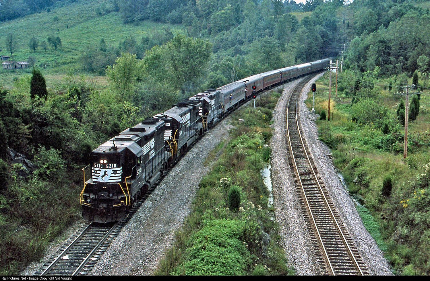 | A few miles north of its origination at Kingsport this Watauga Chapter NRHS excursion is diverging from the former Clinchfield main onto NS's former Southern Appalachia Division heading railroad west. They will be in Virginia in about 1/2 mile. A very eclectic set of power and passenger cars on a well managed excursion. |