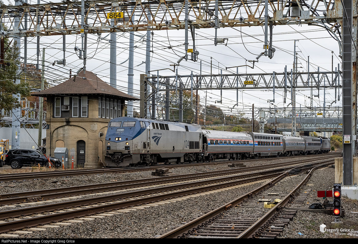 On October 29th, 2025, Amtrak Inspection Extra Train 847 passes the iconic Devon Tower at CP 261 on the CTDOT/ Metro-North Railroad New Haven Line in Milford, Connecticut. The train was composed of Amtrak’s fleet of inspection cars, sandwiched between electric ACS-64 #609 and diesel GE P42DC #124 to allow unrestricted movement across the Northeast Corridor, and was tasked with inspecting most NEC routings over the course of just a few days.
