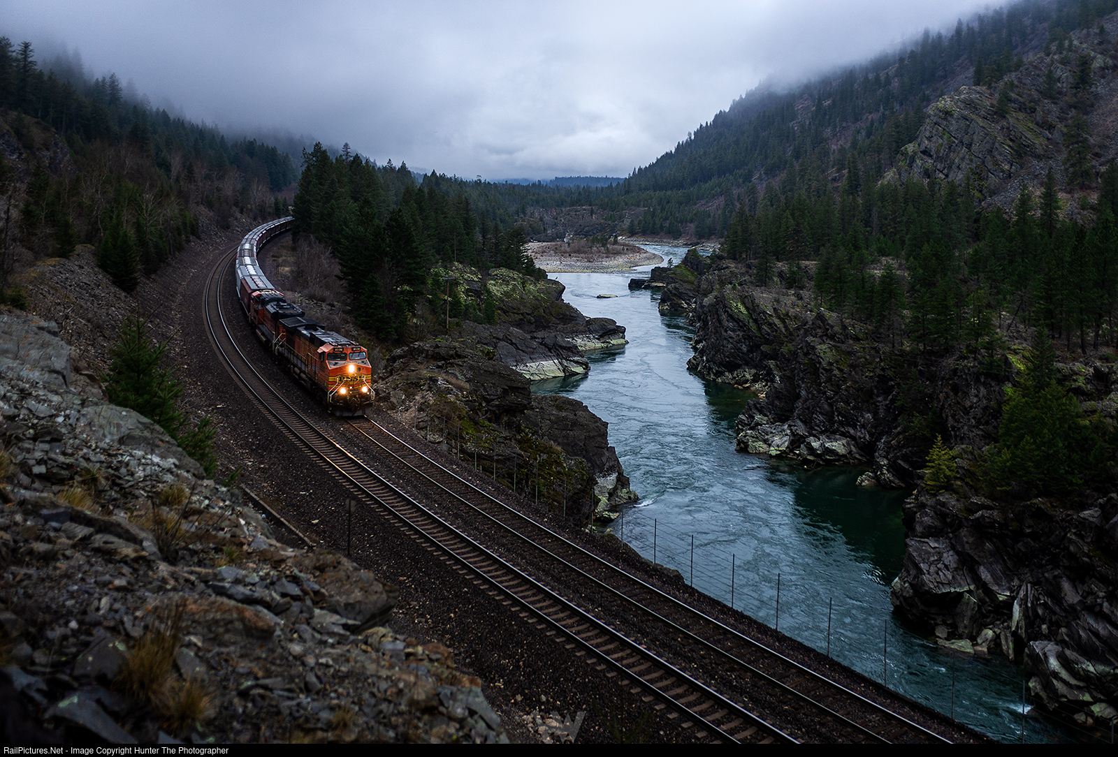 | On The Rocks | Traversing the small cliff above the Kootenai River at Kootenai Falls, MT, an eastbound train of empty grain hoppers takes the siding in preperation to meet a westbound train on the gloomy morning of Sunday, February 1, 2026. |
