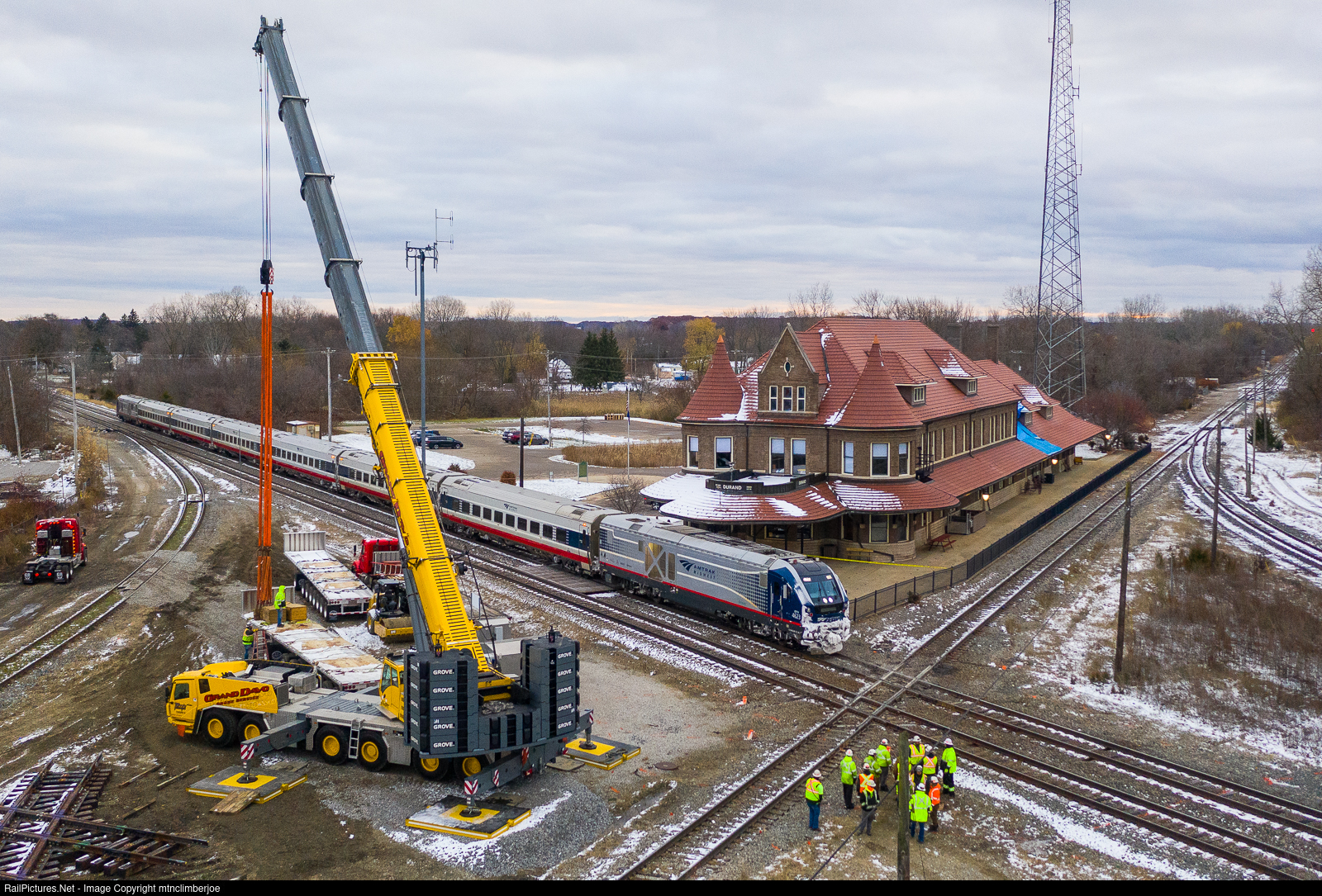 | Amtrak's Blue Water service slows to a stop at the station in Durand, Michigan on the CN Flint Subdivision as the last train before a work window starts. CN MOW crews are on site and preparing to work on replacing the diamond here where the Holly Subdivision crosses. |