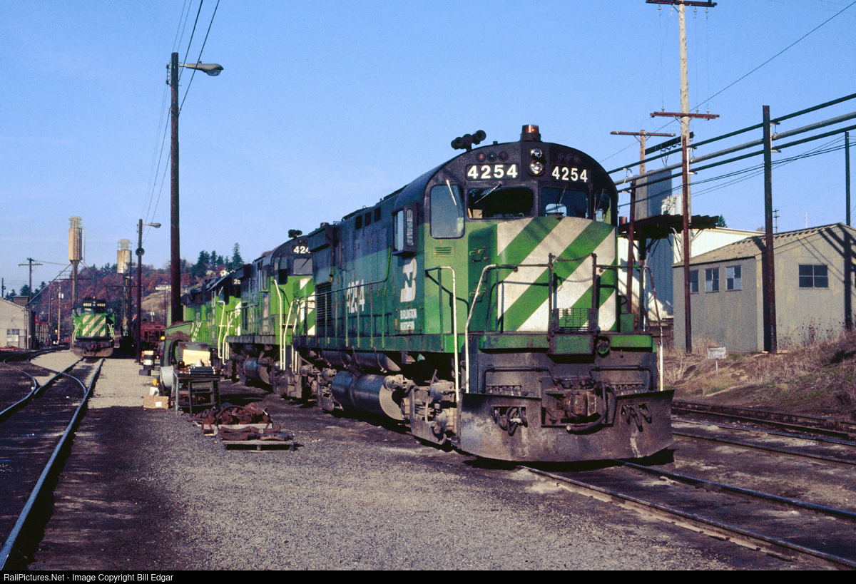 | BN Alco C425 no. 4254 idles with a mixed consist of Alco and EMD power between assignments at Vancouver, WA. BN assigned its Alco fleet to Vancouver after the 1970 merger. Prior to that Northern Pacific maintained their fleet in Minnesota. GN and SP&S kept theirs in Washington state. |
