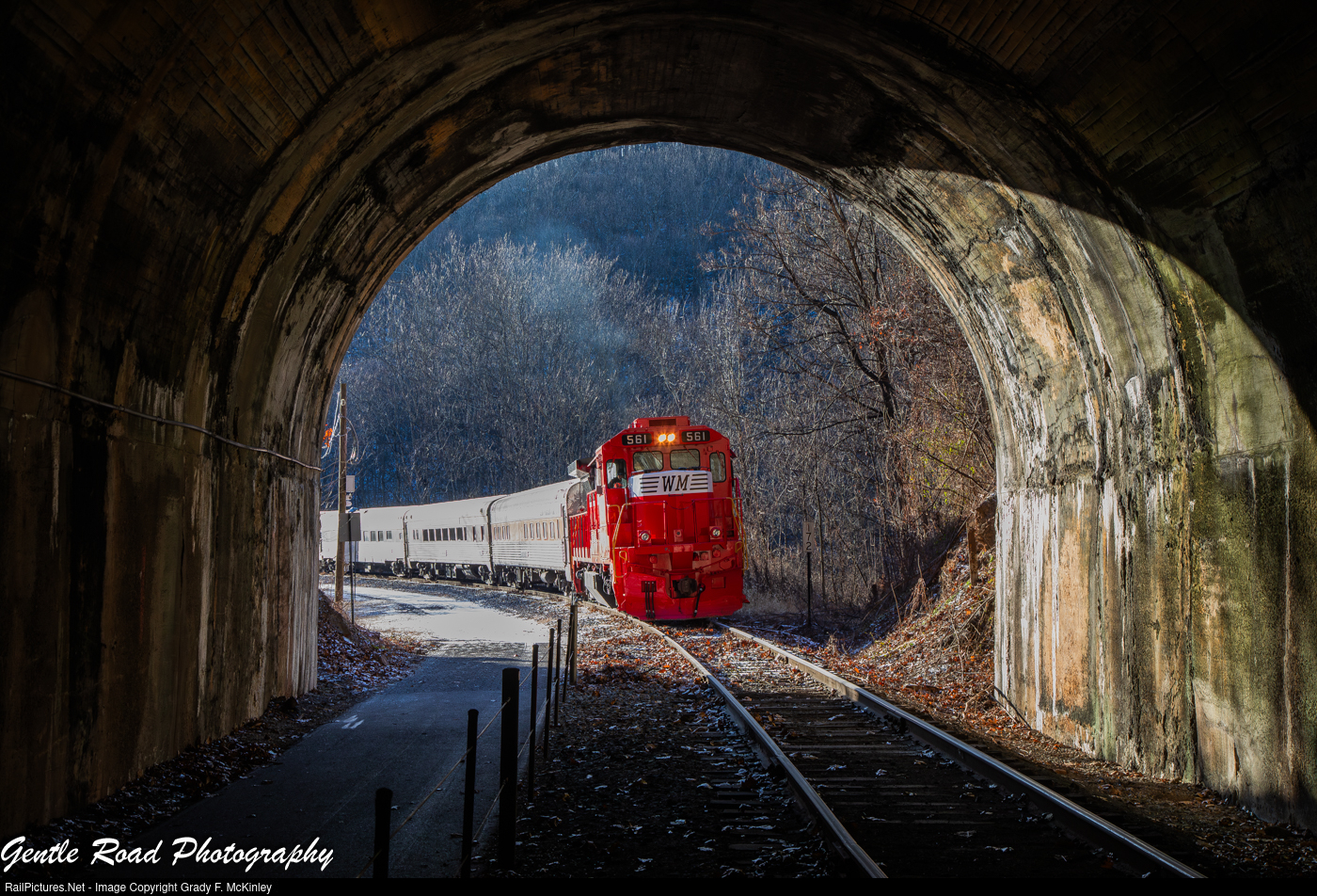 Western Maryland Scenic Railroad's B32-8 #561 leads a photographer special westbound at Brush tunnel. The train paused at the tunnel entrance for photos from inside the tunnel.