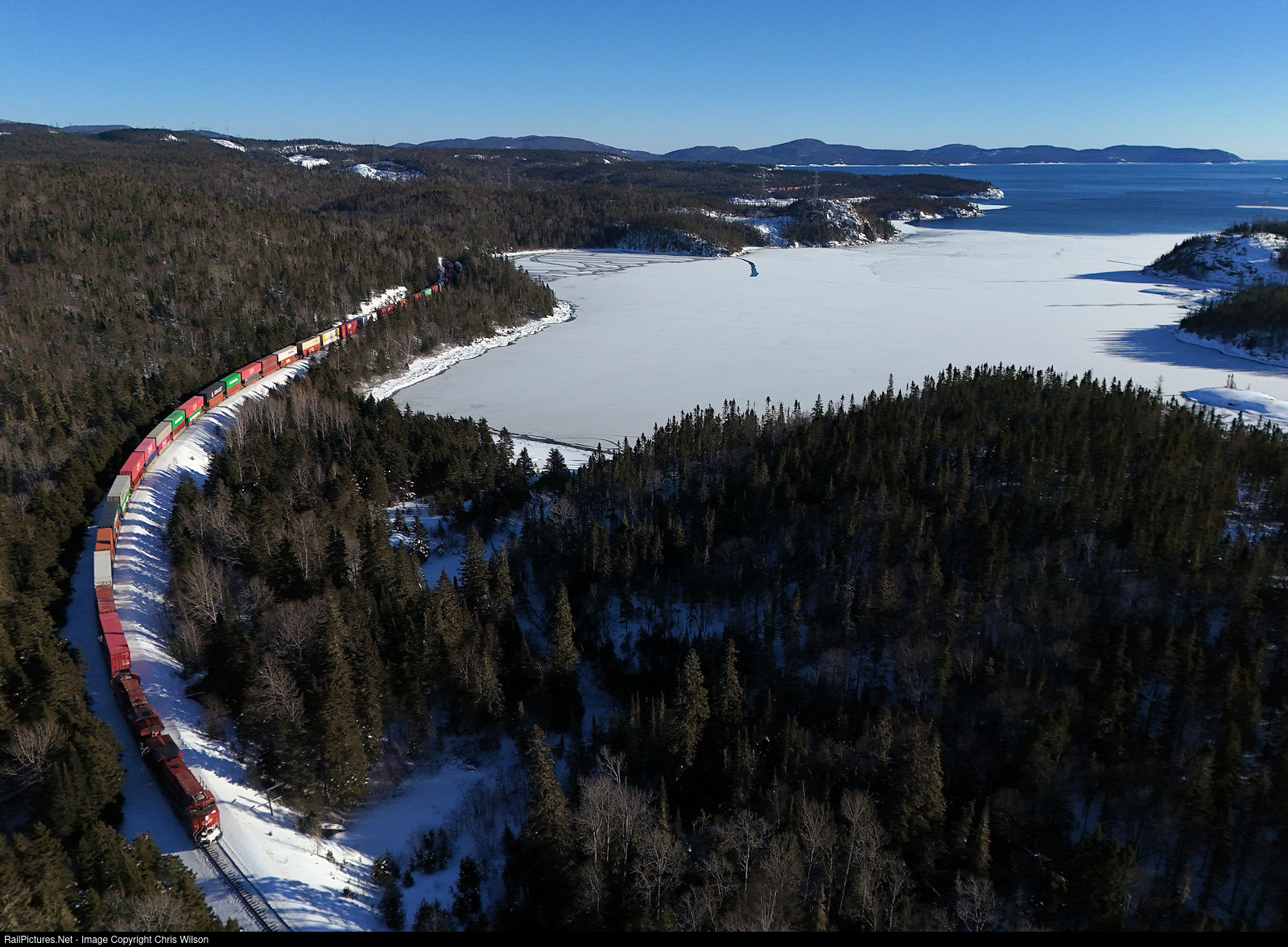 A pair of Canadian Pacific ES44AC's pull a reprofiled 113 west along the Heron Bay Subdivision across the north shore of Lake Superior west of Neys.