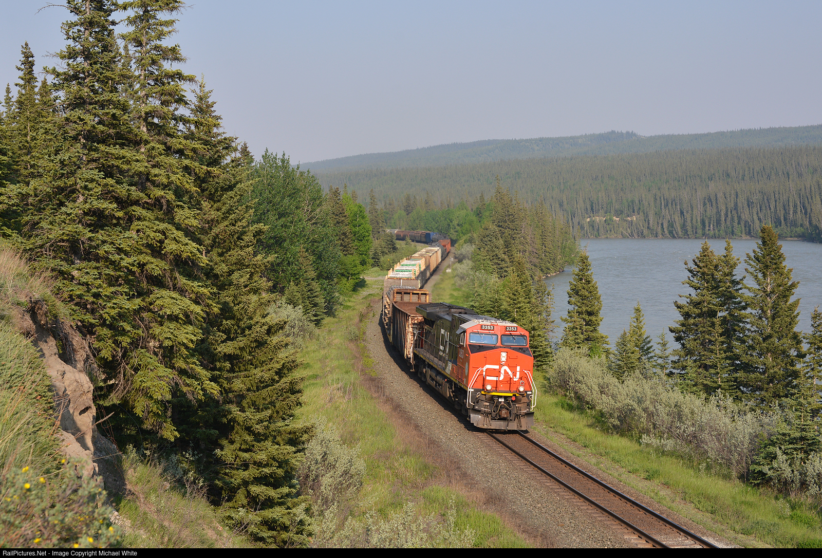 A freshly rebuilt AC44C6M leads a 20000-ton mixed fright along the Athabasca River.